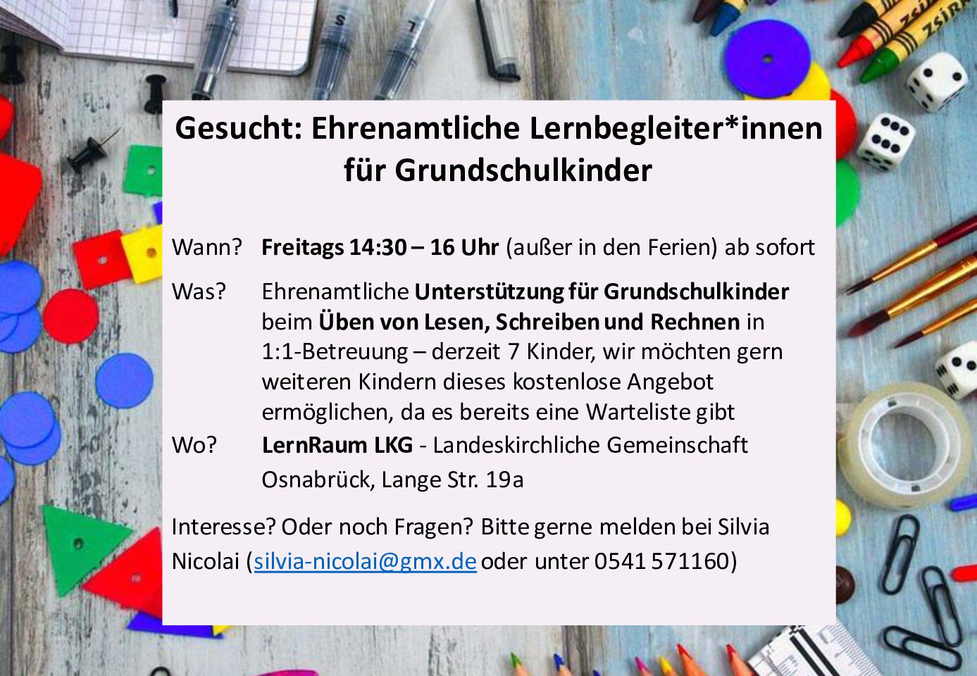 FREITAGS, 14:30 UHR Jeden Freitag (außer in den Ferien) erhalten Grundschulkinder von 14h30 bis 16 Uhr im LernRaum kostenlos Unterstützung beim Lernen von Lesen, Schreiben und Rechnen durch ehrenamtliche Lernbegleiter*innen. Dabei ist die Lernförderung immer individuell an den Bedarf des jeweiligen Kindes angepasst (1:1-Betreuung). Auch miteinander Erzählen und Lachen haben dabei ihren festen Platz und … LernRaum weiterlesen